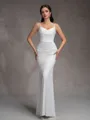 Chic sheath wedding dress featuring spaghetti straps, a sleeveless design, and intricate pleats. The gown is crafted from luxurious charmeuse fabric, and its appeal is heightened by a court train. The corset detail adds a touch of sophistication to this modern and elegant bridal ensemble.