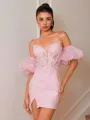 This sheath dress combines delicate spaghetti straps with short sleeves for a unique and stylish look. Adorned with intricate lace appliques, it exudes elegance and texture. The corset bodice defines the waist, and the short/mini length creates a modern, flattering silhouette-perfect for special occasions.