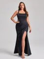 This sheath bridesmaid dress features a modern square neckline and sleeveless design. Crafted from smooth satin with elegant pleats, it offers a sleek and flattering fit. The floor-length silhouette creates a graceful and sophisticated look-perfect for plus size bridal parties.