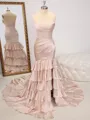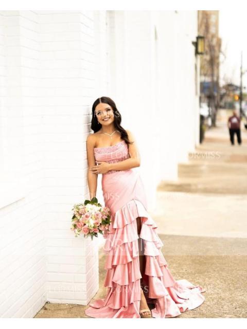 An elegant sheath dress with a straight silhouette, crafted from luxurious silk-like satin. Featuring intricate lace appliques, a sleeveless design, and a corset bodice for a tailored fit. The court train adds a touch of sophistication, making it ideal for formal events or weddings.
