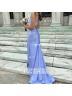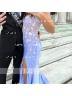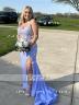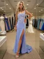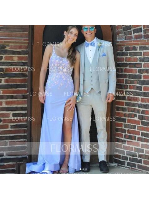 This is a sleeveless sheath dress with straps, adorned with appliques lace. The dress features a sweeping train and a corset-style bodice, creating an elegant and sophisticated look.
