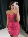 Elegant sheath dress featuring a sweetheart neckline and covered in sparkling sequins. The corset bodice accentuates the waist, and the short, mini length adds a chic, glamorous flair.