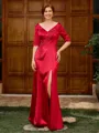 This mother of the bride dress features a sheath silhouette with a V-neckline and 1/2 sleeves. Adorned with appliques lace, it is made from floor-length silk like satin, offering a sophisticated and elegant look.