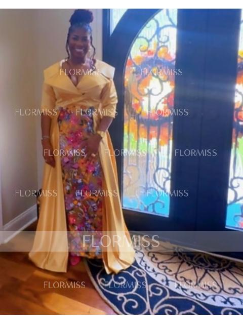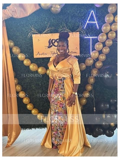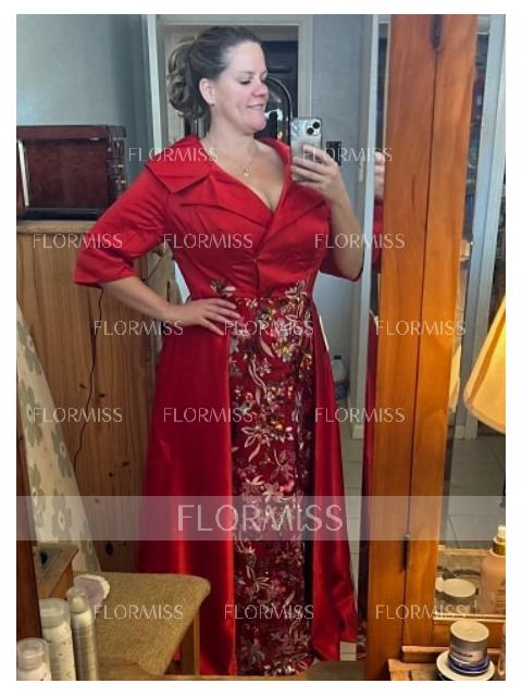 • Sheath V-neck 1/2 Sleeves Appliques Lace Floor-Length Satin Corset Mother of the Bride Dress
