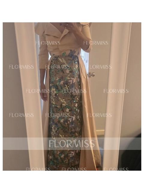 This sheath mother of the bride dress features a flattering V-neckline, 1/2 sleeves adorned with lace appliques, a floor-length satin skirt, and a fitted corset bodice. Combining elegance and sophistication, it creates a graceful and timeless silhouette perfect for a memorable wedding celebration.