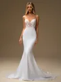 Radiate elegance in this sheath wedding dress, featuring a V-neckline, sleeveless design, and intricate lace appliques. Crafted from stretch crepe fabric, it boasts a stunning cathedral train and a flattering corset bodice.