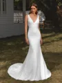Sleeveless A-line wedding dress with a V-neck, pleated details, and a chapel train in stretch crepe fabric.