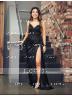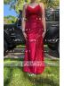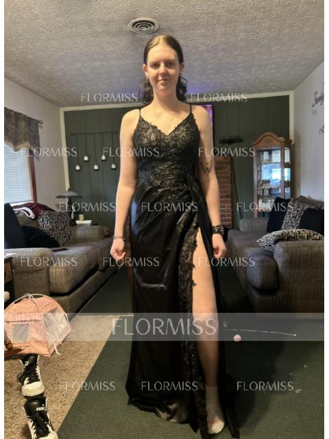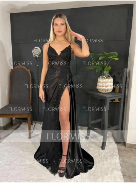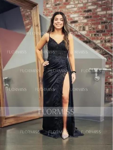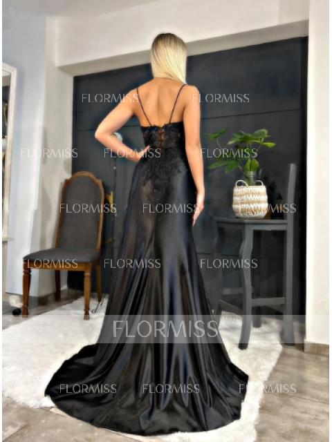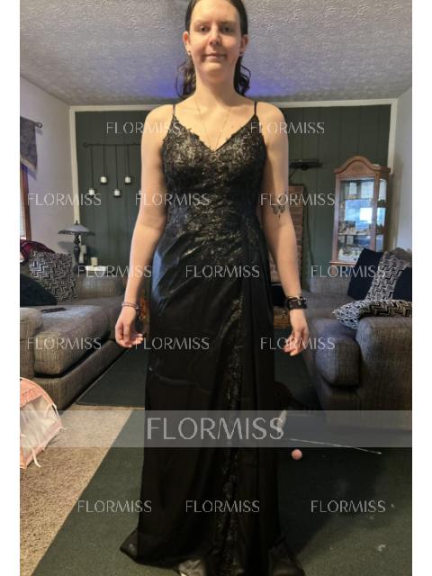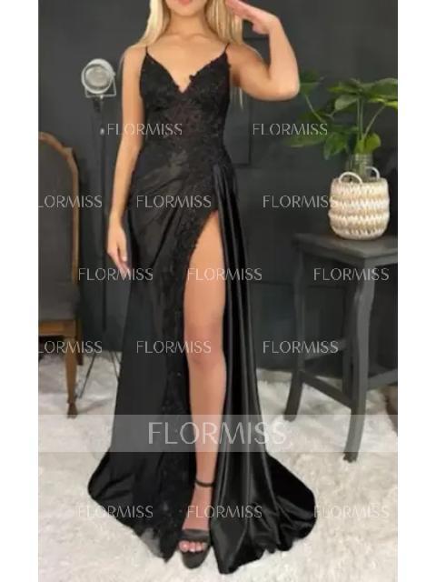 This is a sleeveless sheath dress with a V-neckline, adorned with appliques lace. The dress is made of silk like satin and features a sweeping train for added flair, creating a stylish and sophisticated look.