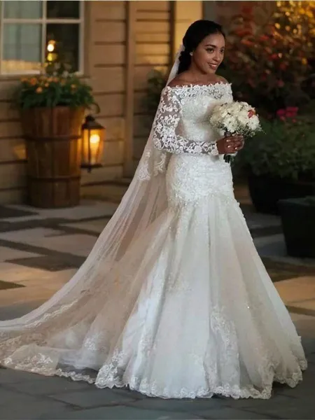 • Trumpet/Mermaid Off-the-Shoulder Sweep Train Tulle Wedding Dresses With Appliques Lace