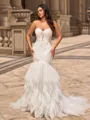 This mermaid wedding dress features a flattering sweetheart neckline and sleeveless design, beautifully embellished with intricate lace appliques. The figure-hugging silhouette is crafted from soft tulle, creating a romantic and elegant look. The court train adds a graceful touch, making this gown perfect for a bride who desires a stunning, sophisticated style with delicate detailing.