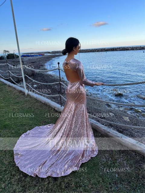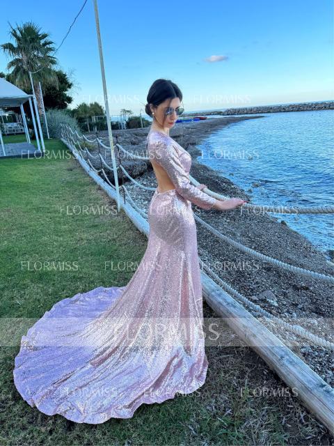 Trumpet/Mermaid V-neck Court Train Sequins Prom Dress With Ruffles